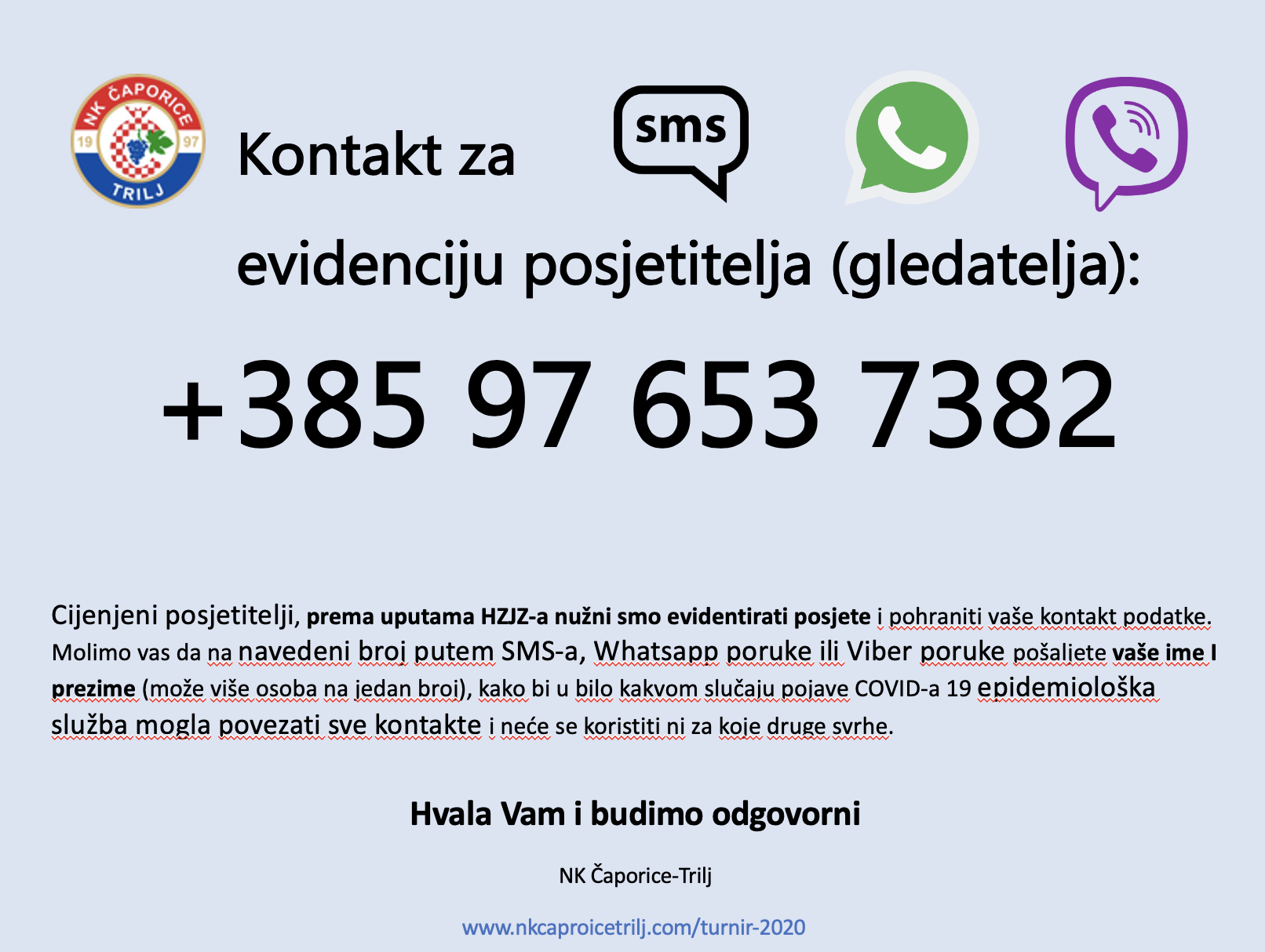 Mole se svi posjetitelji da prilikom dolaska na turnir na broj +385976537382 pošalju svoje ime i prezime putem SMS, Whatsapp ili Viber poruke radi izrade evidencije posjetitelja koja je potrebna prema uputama HZJZ u slučaju pojave COVID-a 19 i praćenja kontakata. Članovi kluba i igrači bit će navedeni na prijavnoj listi koju klubovi predaju turnirskoj komisiji na kojoj treba biti naveden i kontakt broj trenera, stoga igrači koji nastupaju na turniru i treneri nemaju potrebe za evidentiranjem na navedeni broj ako su evidentirani na prijavnoj listi.